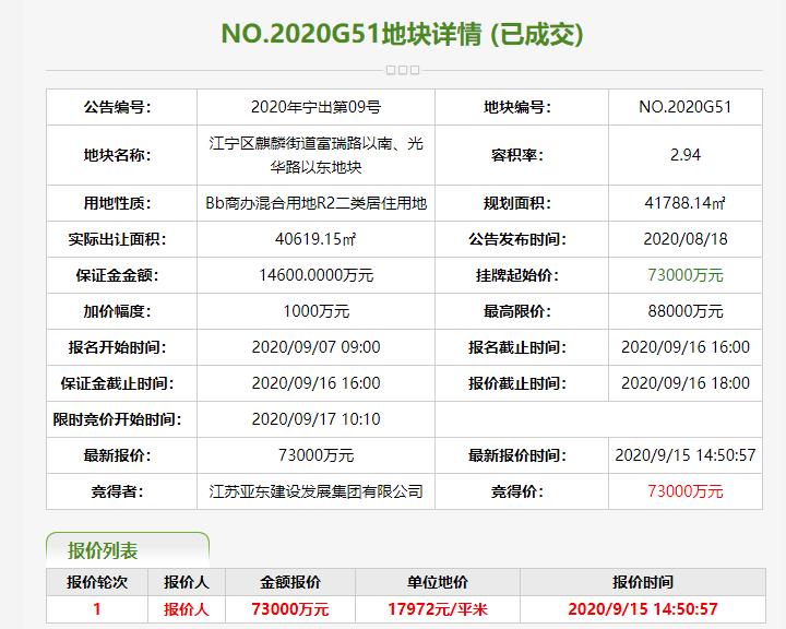 中國網地產訊 9月17日,南京9宗地塊集中出讓,最終江蘇亞東建設發展集團有限公司以7.3億元競得NO.2020G51號地塊,樓麵價6112.86元/平。