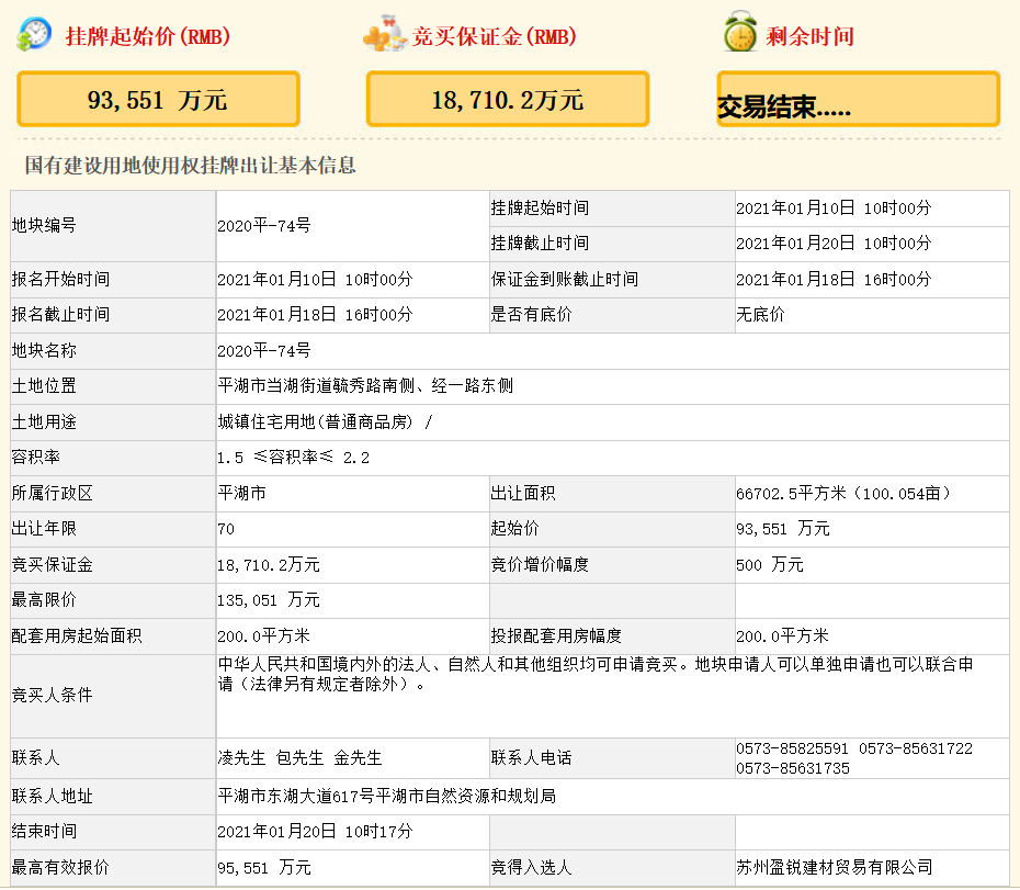經過5輪競價,蘇州盈銳建材貿易有限公司(卓越)以9.56億元競得2020平-74號地塊,樓麵價6511元/㎡,溢價率2.14%。