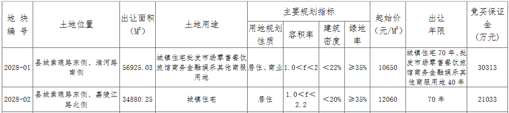資料显示,該地塊位於縣城紫琅路東側、嘉陵江路北側。出讓面積34880.25㎡,起始價4.21億元,競買保證金2.1億元,建築密度<20%,綠地率≥35%,建築高度≤80米。