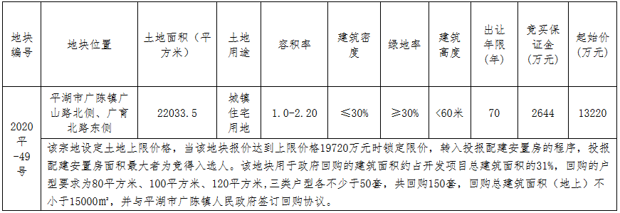 資料显示,該地塊編號為2020平-49號,位於平湖市廣陳鎮廣山路北側、廣育北路東側。出讓面積22033.5㎡,起始價13220萬元,競買保證金2644萬元,建築密度≤30%,率≥30%,建築高度<60米。