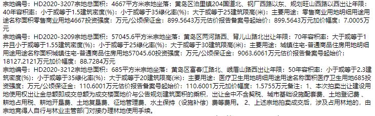 地塊編號HD2020-3209號,地塊位於黃島區兩河路西、背兒山路北,佔地面積57045.6㎡,建築面積113750.5㎡,出讓年限七十年,規劃用途為城鎮住宅用地,容積率≤2.3,建築密度≤25%,綠化率≥30%,樓面地價2043元/㎡。