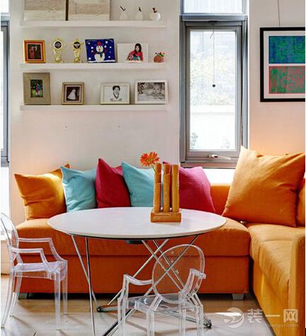 裝飾tips:橘色的沙發,鮮亮明艷,提升了整個小戶型客廳的亮度,繽紛的靠包裝飾,過渡了單一色彩的沉悶,讓客廳變得鮮活起來。