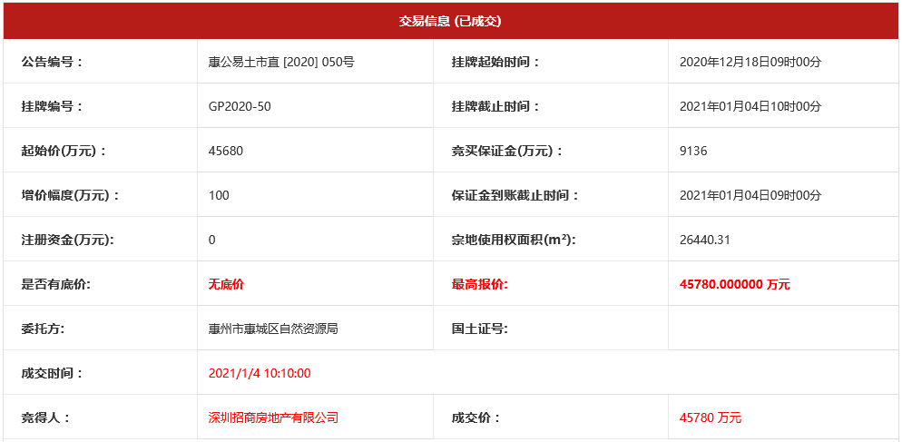中國網地產訊 1月4日,廣東省惠州市以網上掛牌方式成功出讓一宗商住用地。最終,深圳招商有限公司(招商蛇口)以4.58億元競得GP2020-50地塊,溢價率0.22%。