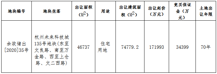 資料显示,該地塊編號為余政儲出[2020]35號,位於未來科技城135號地塊,東至文良路、南至萬金路、西至上倉路、文二西路。出讓面積46737㎡,起始價171993萬元,競買保證金34399萬元。
