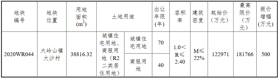 資料显示,該地塊編號為2020WR044號,位於大嶺山鎮大沙村。出讓面積38816.32㎡,起始價122971萬元,最高限價181766萬元,競買保證金30000萬元,建築密度≤22%,加價幅度500萬元。