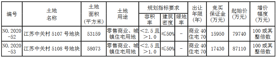 江蘇中關村5107號地塊成交價79840萬元。地塊編號為NO.2020-53。出讓面積53159,起始價79740萬元,競買保證金15950萬元,建築密度≤50%,綠地率,建築高度。