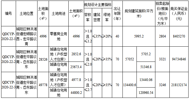 QDCYP-2020-22-1地塊成交價1681.0541萬元,樓麵價2804元/㎡。該地塊位於城陽區棘洪灘街道宏順路以西、宏平路以南。出讓面積4996㎡,起始價1681.0541萬元,建築密度≤35%,率≥20%。
