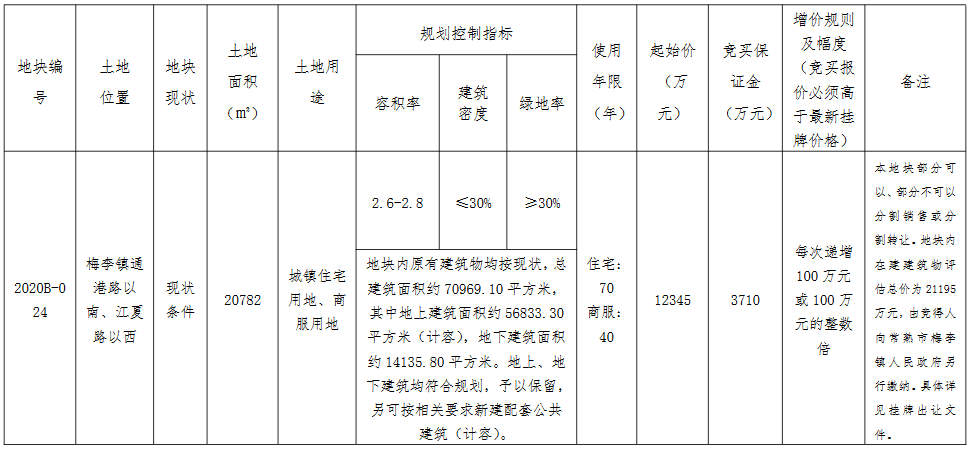 資料显示,該地塊位於梅李鎮通港路以南、江夏路以西。出讓面積20782㎡,起始價12345萬元,競買保證金3710萬元,建築密度≤30%,率≥30%。