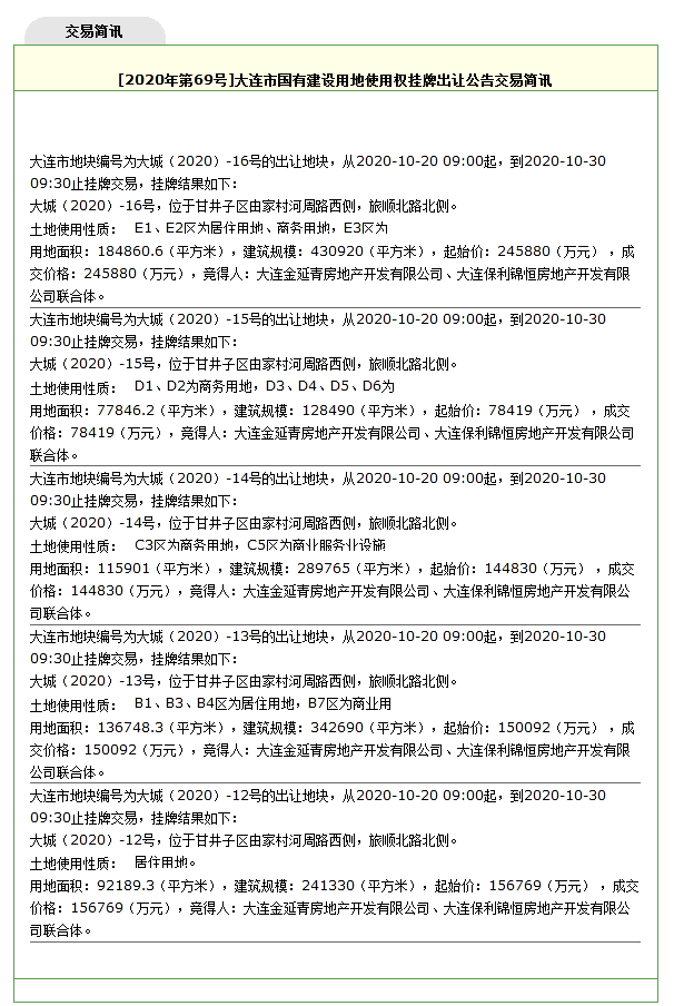 中國網地產訊 據大連市土地交易中心網站消息,甘井子區由家村5宗聯合地塊30日成功出讓,由大連金延青開發有限公司、大連保利錦恆房地產開發有限公司。(金地+保利)聯合體底價77.59億元競得。