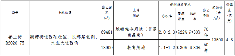 資料显示,該地塊編號為善土告字[2020]50號,位於魏塘街道西項社區,民輝路北側、木業大道西側。出讓面積83381㎡,起始價11.26億元,競買保證金4.5億元,率≥30%。