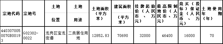 資料显示,該地塊位於寶龍街道。出讓面積12852.83㎡,起始價32000萬元,競買保證金16000萬元。
