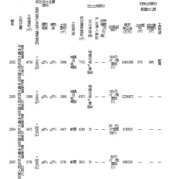 地塊編號20035號,地塊位於平度市區青啤大道東側、規劃人民路北側,土地面積3.17萬平,規劃建築面積3.81萬平,規劃用途為教育用地,出讓年限五十年,競買保證金1086.22萬元,成交價1086.22萬元。