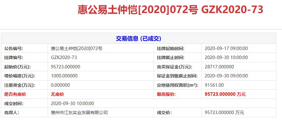 地塊編號惠公易土仲愷[2020]072號,地塊名稱為惠環輕軌站北片區城市更新單元ZKA-009-14-01號、ZKA-009-15號、ZKA-012-08號地塊,地塊位於惠環街道,用地性質為商服及住宅用地,宗地使用權總面積9.15萬平,出讓年限為住宅七十年,商服四十年,公共服務五十年 ,起始價9.57億元。