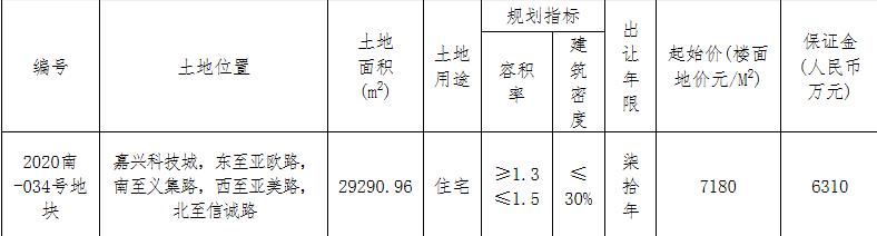 地塊編號嘉土告南字〔2020〕27號,地塊名稱為2020南-034號地塊,出讓面積2.92萬平,用途為住宅用地,容積率1.5,建築面積4.39萬平,起始價3.15億元。