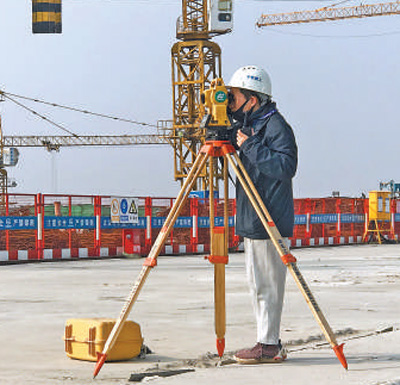 鄭州南站施工現場,測量員正在用全站儀進行施工點位測量。