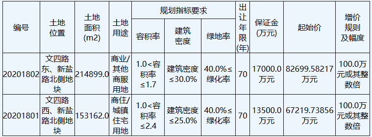20201802地塊位於文四路東、新鹽路北側。出讓面積214899㎡,起始價82699.58217萬元,競買保證金17000萬元,建築密度≤30%,綠地率≥40%。