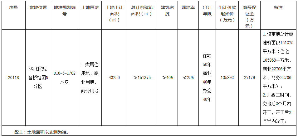 資料显示,該地塊編號為20118,位於渝北區觀音橋組團D分區。出讓面積43250㎡,起始價135892萬元,競買保證金27179萬元,建築密度≤40%,率≥25%,建築高度≤。