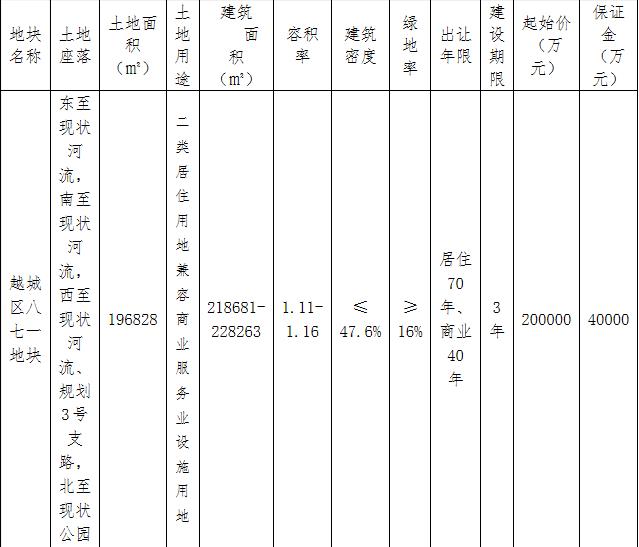 地塊編號紹市自然告字[2020]51號,地塊名稱越城區八七一地塊,出讓面積19.68萬平,用途為商住用地,容積率1.16,建築面積22.82萬平,起始價20億元。
