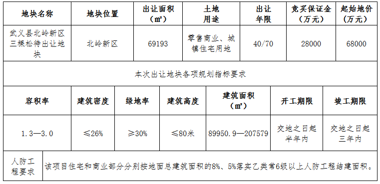 資料显示,該地塊編號為武土讓告字〔2020〕28號,位於北嶺新區。出讓面積69193㎡,起始價68000萬元,競買保證金28000萬元,建築密度≤26%,率≥30%,建築高度≤80米。