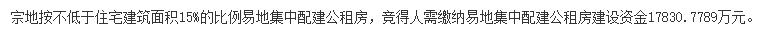 據土地出讓文件显示,宗地按不低於住宅建築面積15%的比例易地集中配建公租房,競得人需繳納易地集中配建公租房建設資金17830.7789萬元。