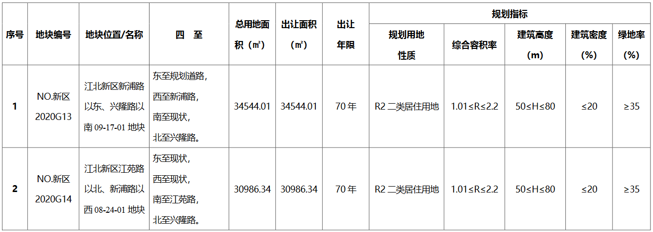 NO.新區2020G13地塊,位於江北新區新浦路以東、興隆路以南,東至規劃道路,西至新浦路,南至現狀,北至興隆路。出讓面積34544.01㎡,起始價15.3億元,競買保證金7.65億元,建築密度≤20%,率≥35%,50米≤建築限高≤80米。