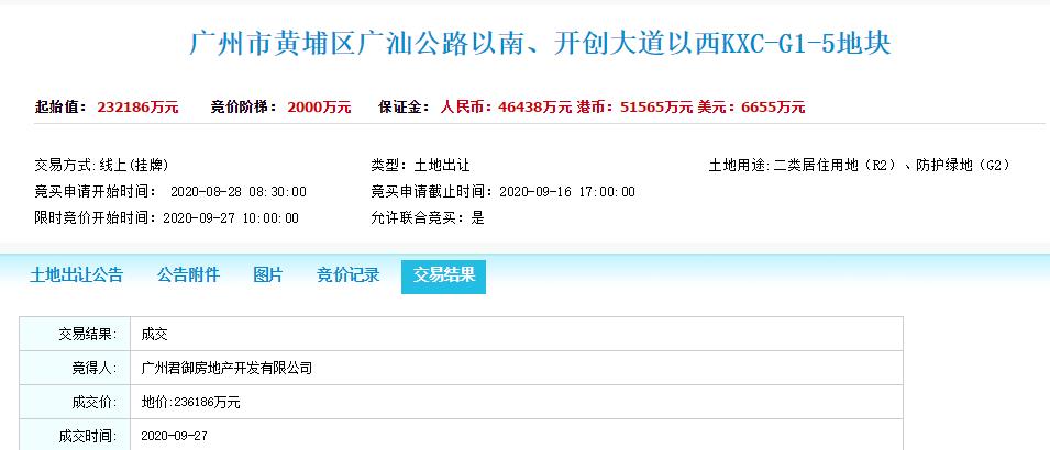 廣州君御(保利&翔龍)以236186萬元競得廣州市黃埔區廣汕公路以南、開創大道以西KXC-G1-5地塊,成交樓麵價15437元/㎡,實際樓麵價18447元/㎡。