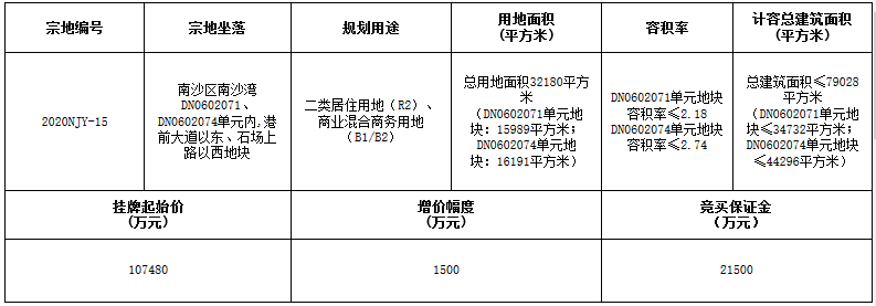 資料显示,該地塊編號為穗南開規劃資源出告字〔2020〕23號,位於南沙區南沙灣DN0602071、DN0602074單元內,港前大道以東、石場上路以西。出讓面積32180㎡,起始價107480萬元,最高限價136160萬元,競買保證金21500萬元。