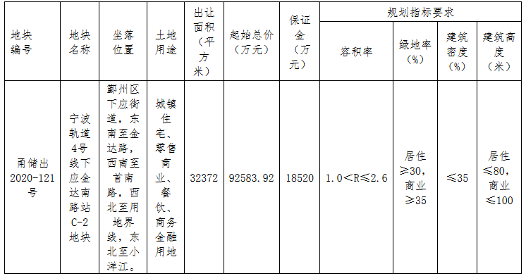 資料显示,該地塊編號為甬儲出2020-121號,位於鄞州區下應街道,東南至金達路,西南至首南路,西北至用地界線,東北至小洋江。出讓面積32372㎡,起始價92583.92萬元,競買保證金18520萬元,建築密度≤35%,率:居住≥30%、商業≥35%,建築高度:居住≤80米、商業≤100米。
