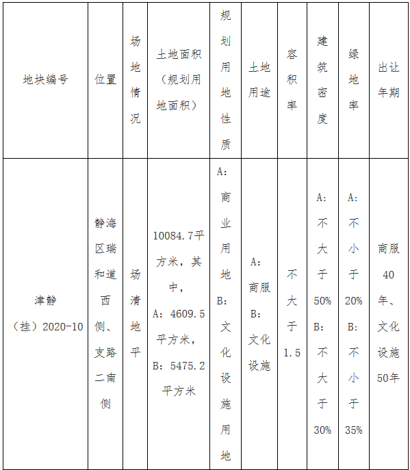 津靜(掛)2020-12號地塊可兼容不大於地上總建築面積10%的商業建築面積;受讓人須在簽訂土地出讓合同之日起12個月內開工建設、48個月內竣工。