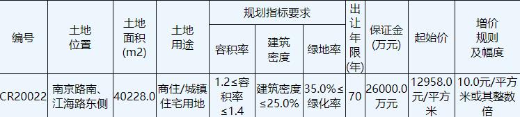 地塊編號CR20022,地塊名稱南京路南、江海路東側地塊,出讓面積4.02萬平,用途為商住用地,容積率1.4,建築面積5.63萬平,起始價5.21億元。