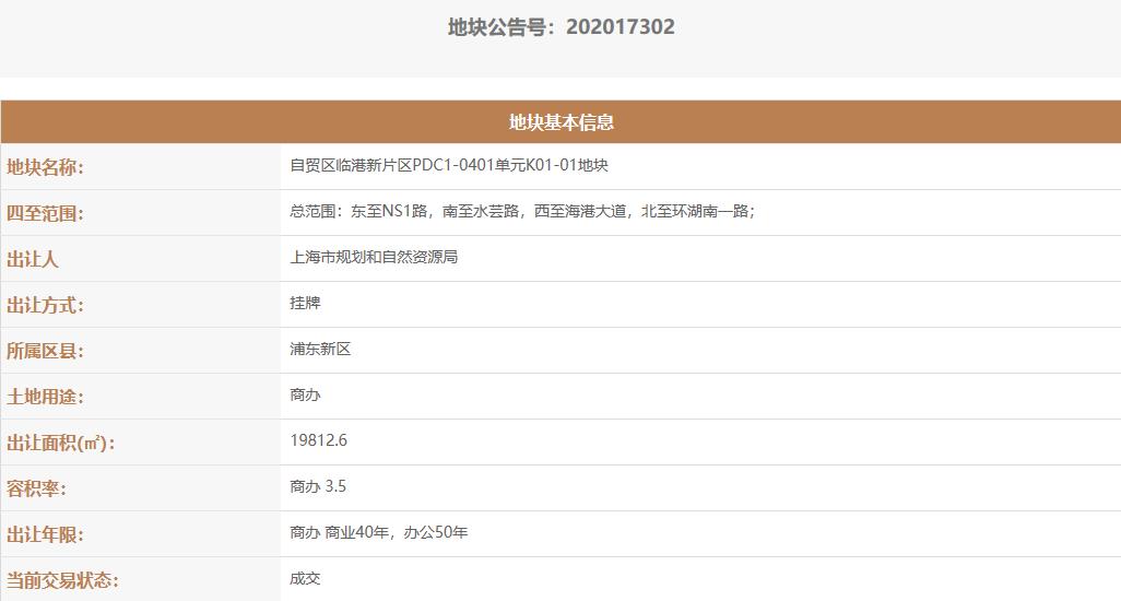 地塊編號202017302,地塊名稱自貿區臨港新片區PDC1-0401單元K01-01地塊,地塊東至NS1路,南至水芸路,西至海港大道,北至環湖南一路;土地用途為商辦用地,出讓面積1.98萬平,起始價3.13億元。
