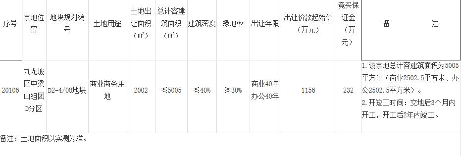 地塊編號20106,地塊位於九龍坡區中梁山組團D分區,地塊規劃編號D2-4/08地塊,土地用途為商業用地、商務用地,土地面積2002平,建築面積5005平(商業2502.5平方米、辦公2502.5平方米),容積率2.5,起始價1156萬元。
