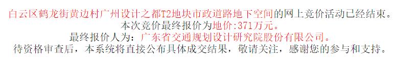 最終廣東省交通規劃設計研究院股份有限公司以371萬元競得白雲區鶴龍街黃邊村廣州設計之都T2地塊市政道路地下空間。