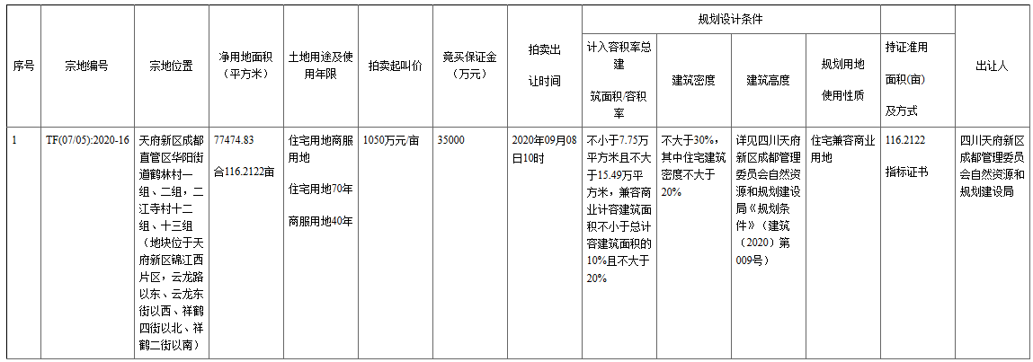 資料显示,該地塊編號為TF(07/05):2020-16,位於天府新區錦江西片區,雲龍路以東、雲龍東街以西、祥鶴四街以北、祥鶴二街以南。凈用地面積77474.83㎡(合116.2122畝),起始價122023萬元,競買保證金35000萬元,建築密度≤30%,其中住宅建築密度≤20%。