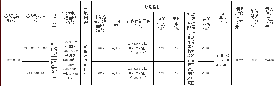 資料显示,該地塊編號為GZK2020-058,位於仲愷高新區惠環街道平南片區。宗地使用權面積95539㎡(其中ZKB-046-15-02號地塊44090㎡、ZKB-046-10號地塊51449㎡),起始價81621萬元,競買保證金24486萬元,率≥25%,建築高度≤100米。