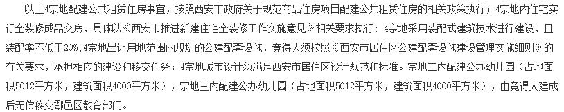 據土地出讓文件显示,按照西安市政府關於規範商品住房項目配建公共租賃住房的相關政策執行;4宗地內住宅實行全裝修成品交房,具體以《西安市推進新建住宅全裝修工作實施意見》相關要求執行;4宗地採用裝配式建築技術進行建設,且裝配率不低於20%;4宗地出讓用地範圍內規劃的公建配套設施,競得人須按照《西安市居住區公建配套設施建設管理實施細則》的有關要求,承擔相應的建設和移交任務;4宗地城市設計須滿足西安市居住區設計規範和標準。宗地二內配建公辦幼兒園(佔地面積5012平方米,建築面積4000平方米),宗地三內配建公辦幼兒園(佔地面積5012平方米,建築面積4000平方米),由競得人建成后無償移交鄠邑區教育部門。