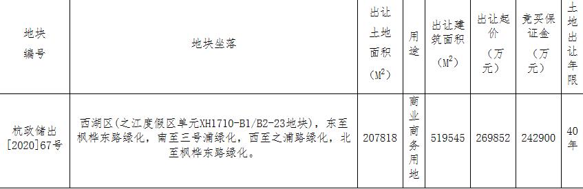 地塊編號杭政儲出[2020]67號,地塊名稱為西湖區(之江度假區單元XH1710-B1/B2-23地塊),出讓面積20.78萬平,用途為商業用地,容積率2.5,建築面積51.95萬平,起始價26.98億元。