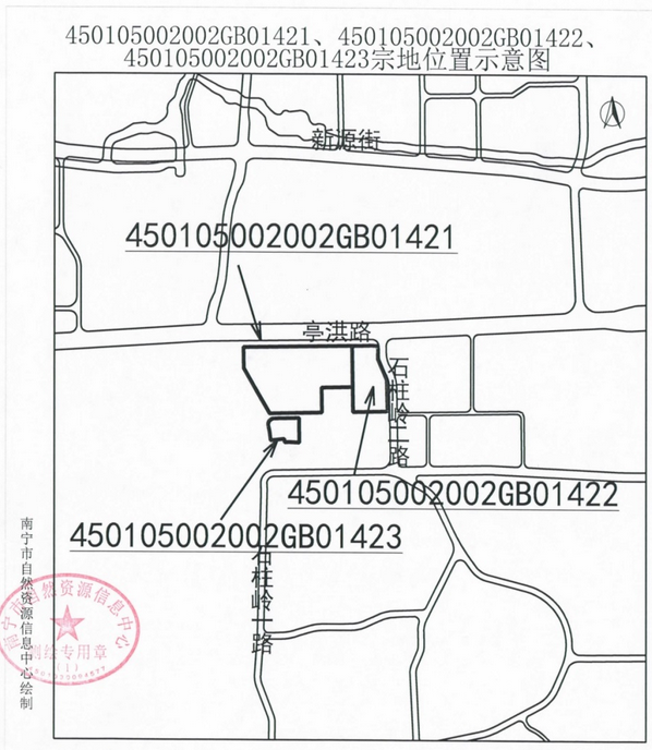 資料显示,該幅地塊編號為GC2020-091,位於江南區亭洪路以南、石柱嶺路以西,由450105002002GB01421、450105002002GB01422、450105002002GB01423宗地組成,出讓藍線編號為CR0101202000030號,實際出讓總面積為50775.18㎡(摺合76.16畝)。